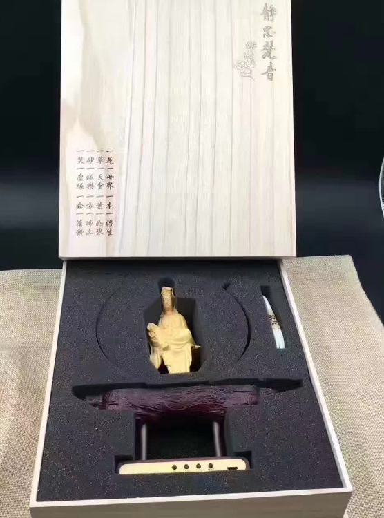 那位师傅说,这件木雕用了血檀木,会散发出一种檀香味,符合整尊木雕像悠然自在的意境;下面的音响部分是整块木头掏空,贴全铜而成,他给这件作品取名《静思梵音》。